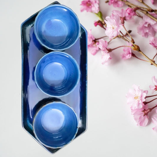 Royal Blue Serveware Set of 3 Ceramic Bowls & 1 Tray