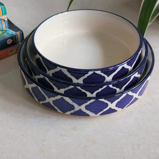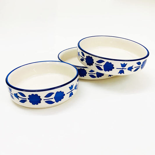 Hand Painted Ceramic Salad / Serving Bowl Set of 3 Flat Bowls 7.5| 6.5| 5.5 inch | White & Blue