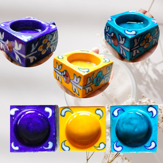 Blue Pottery Multicolor T-Light Candle Holder- Set Of 3