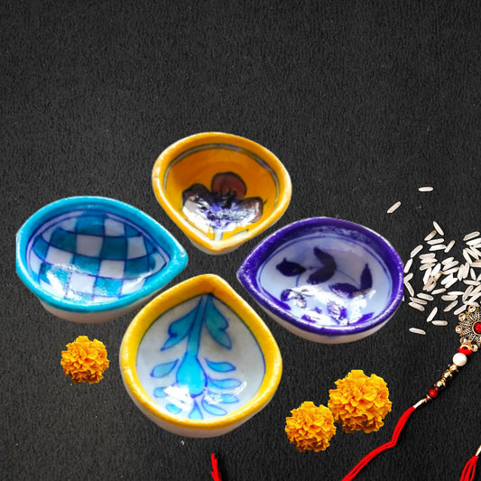 Blue Pottery Diyas in Multi Color Designs- Set Of 4