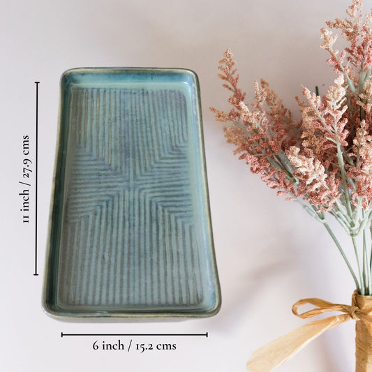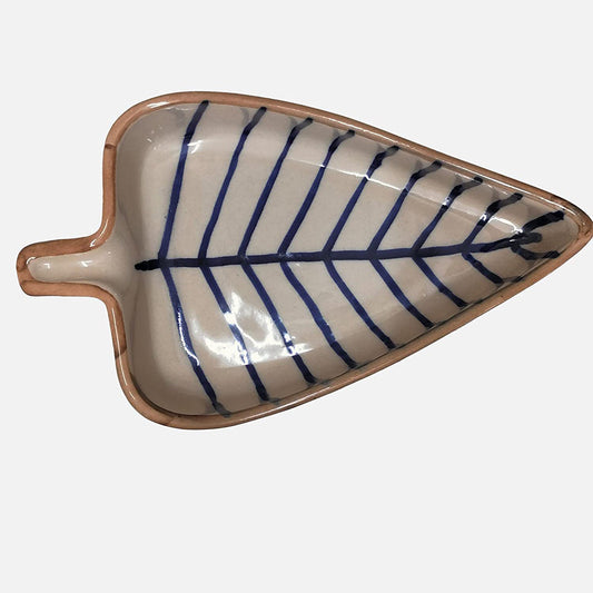 Hand-Painted Ceramic Leaf-Shaped Blue Stripes Glossy Serving Platter | Set of 1