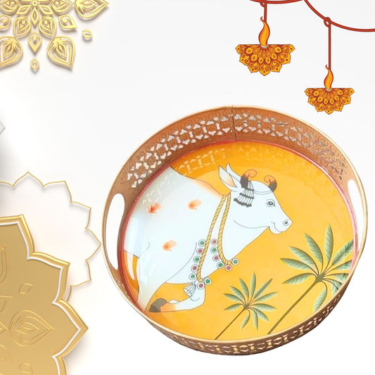 Pichwai Metal Round Tray (Orange) - Set Of Two